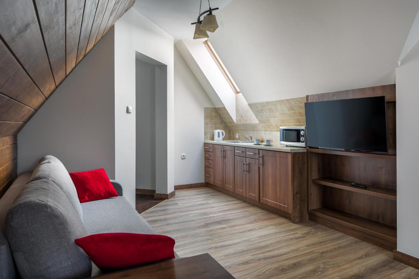 Apartament dwupoziomowy typu Suite. Boasting 1 bedroom and 1 bathroom with a shower, this suite has a well-fitted kitchen and a seating area. Guests can make meals in the kitchen that features a refrigerator, kitchenware and a microwave. The suite features soundproof walls, a wardrobe, an electric kettle, parquet floors, as well as a flat-screen TV with cable channels. The unit offers 3 beds. Apartament typu Suite - 4 osobowy. Powierzchnia pokoju ok.: 40 mkw. ;
