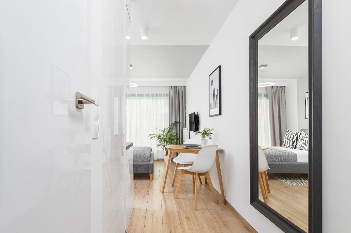 Apartament z 1 sypialnią. Featuring a private entrance, this air-conditioned apartment consists of 1 living room, 1 separate bedroom and 1 bathroom with a walk-in shower and a hairdryer. The well-fitted kitchen features a stovetop, a refrigerator, a dishwasher and kitchenware. The apartment provides a seating area, a dining area, a safe deposit box, an electric kettle, as well as a flat-screen TV. The unit offers 1 bed. Apartament - 2 osobowy. Powierzchnia pokoju ok.: 20 mkw.